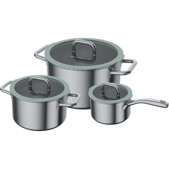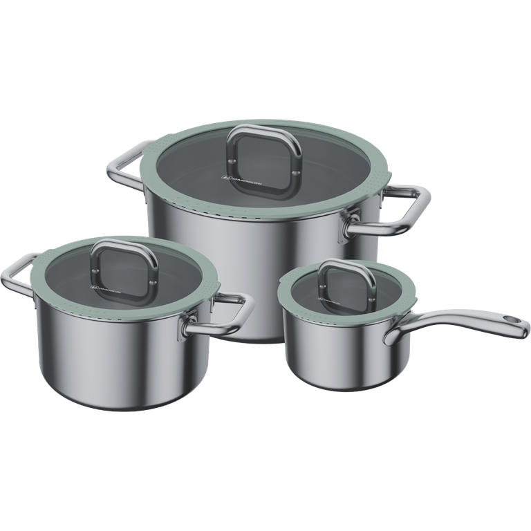 В комплект входят: ковш с антипригарным керамическим покрытием на 1,8 л, кастрюли 3,4 и 5,8 л. Крышки выполнены из закаленного стекла, это позволяет следить за процессом готовки, не открывая крышку, тем самым сохраняя тепло и ароматы внутри.